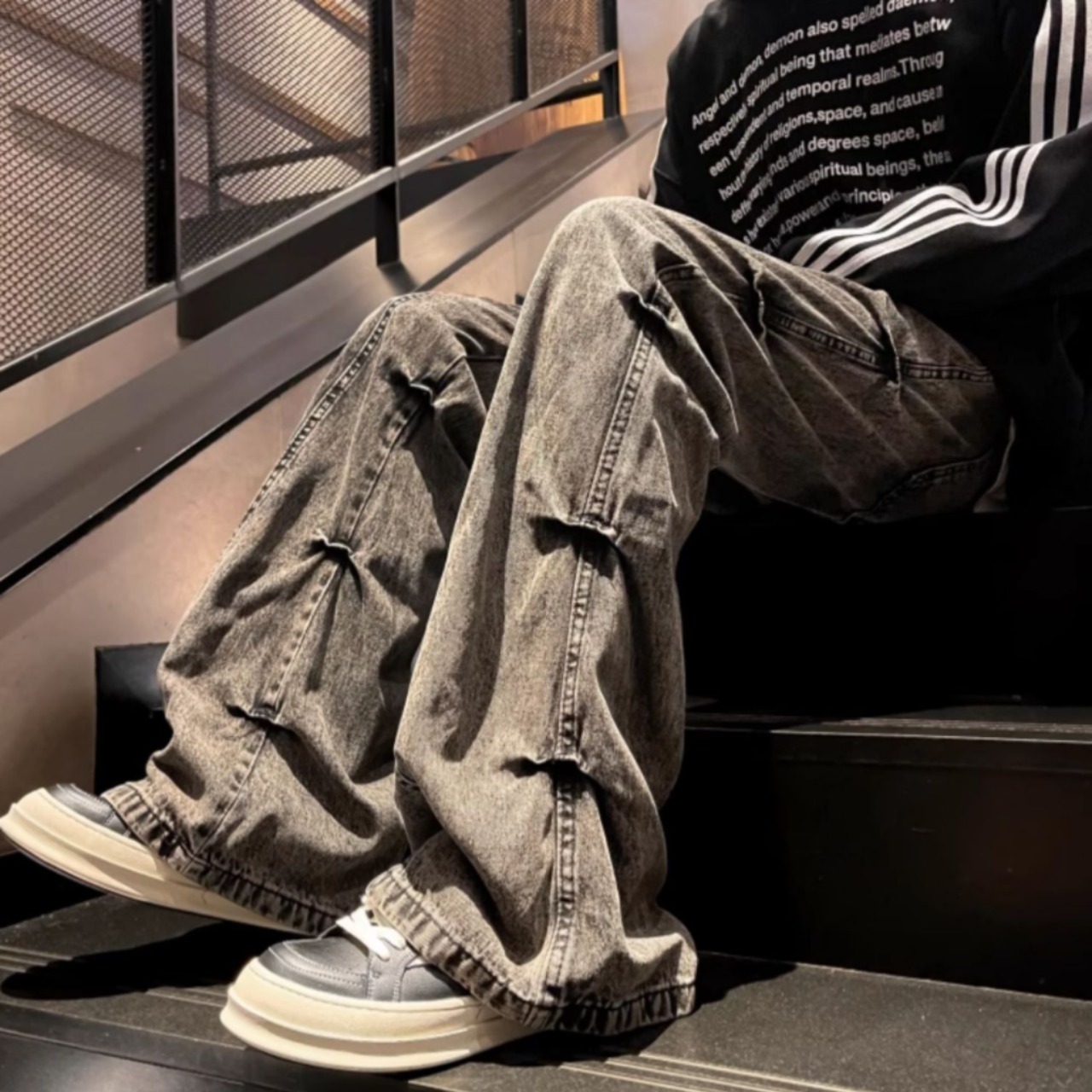 スタイリッシュな印象を与える韓国 ウォッシュ加工ストレートフレアデニム