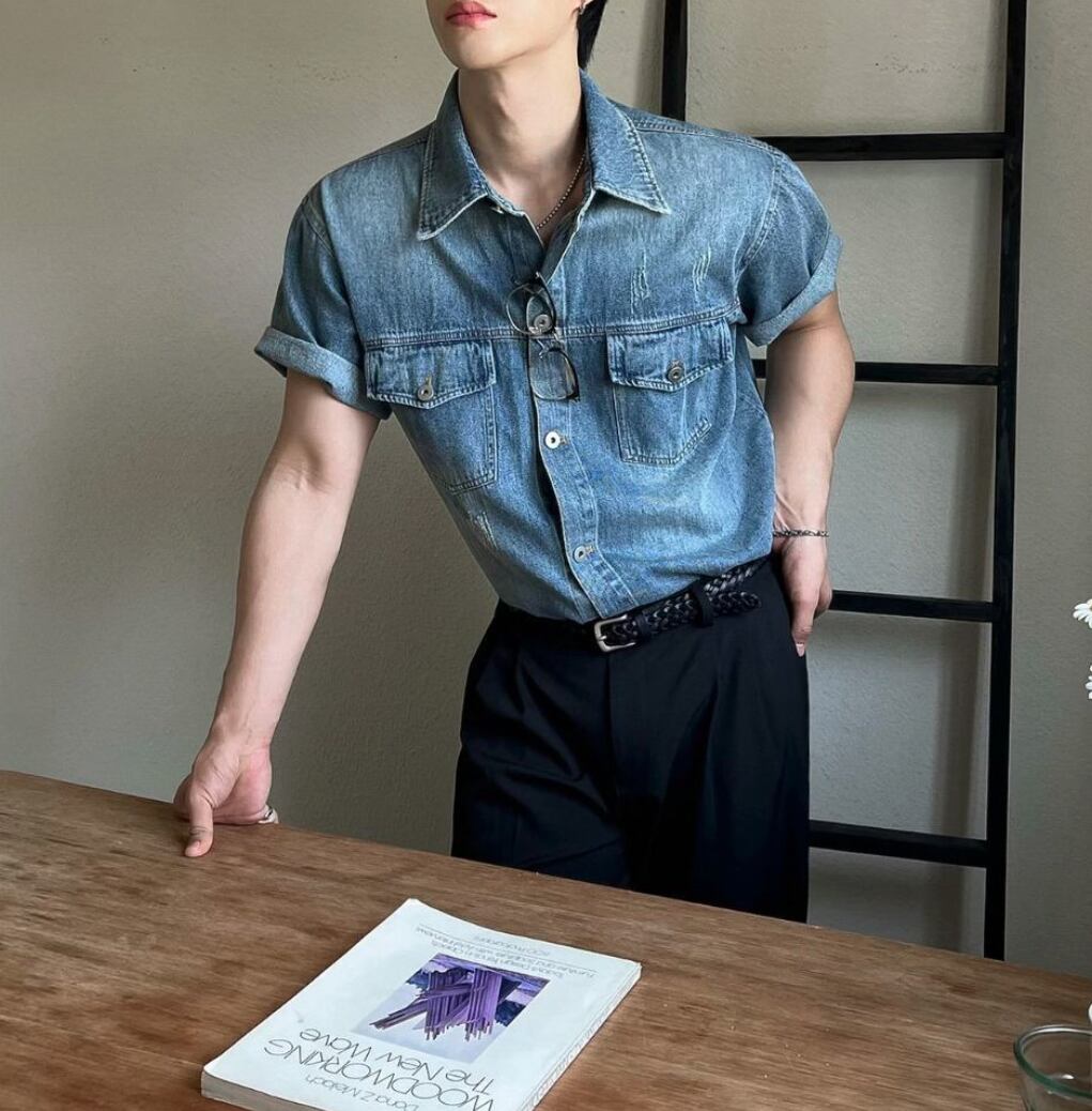スタイリッシュに決まる韓国スタイルのウォッシュデニムシャツ 半袖シャツ