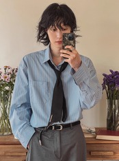 スタイリッシュに着こなすワイドストライプ長袖シャツ 韓国アパレル