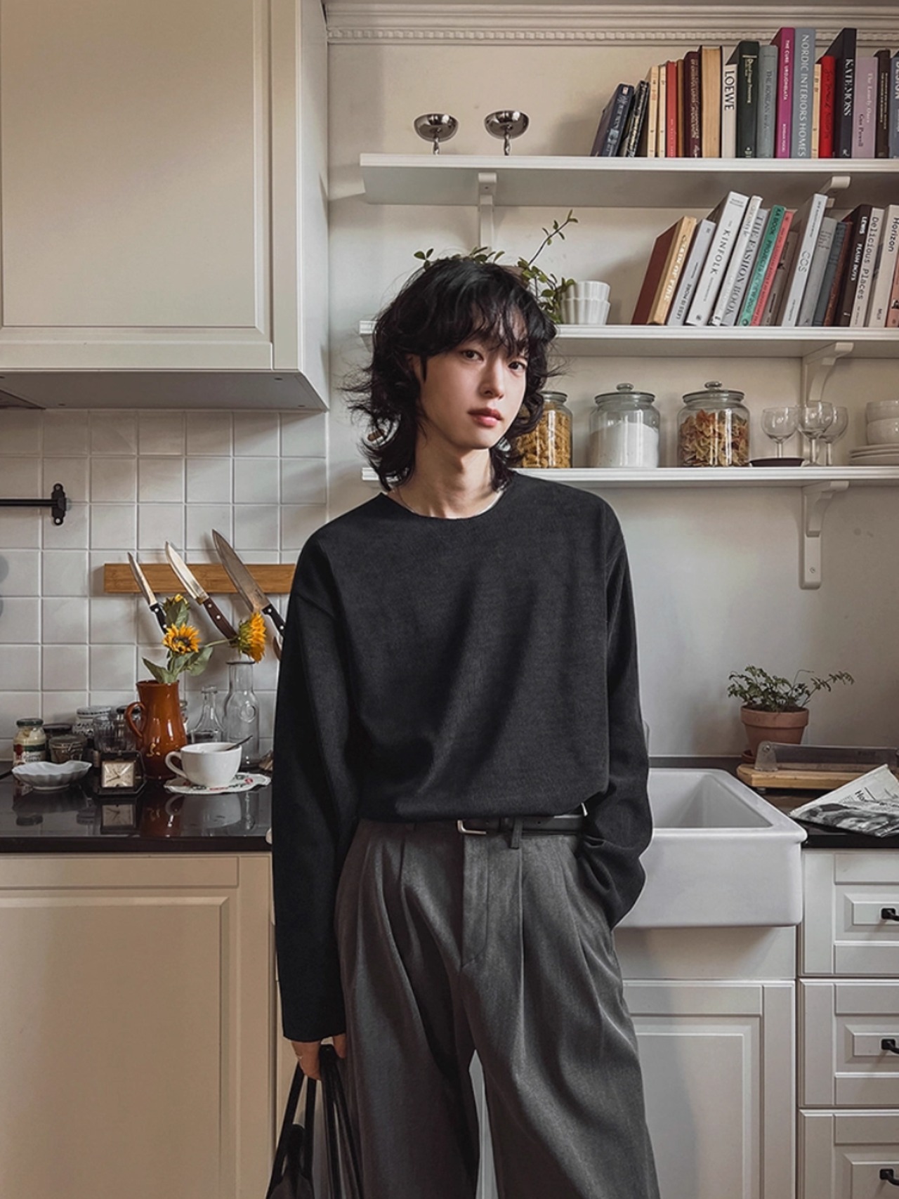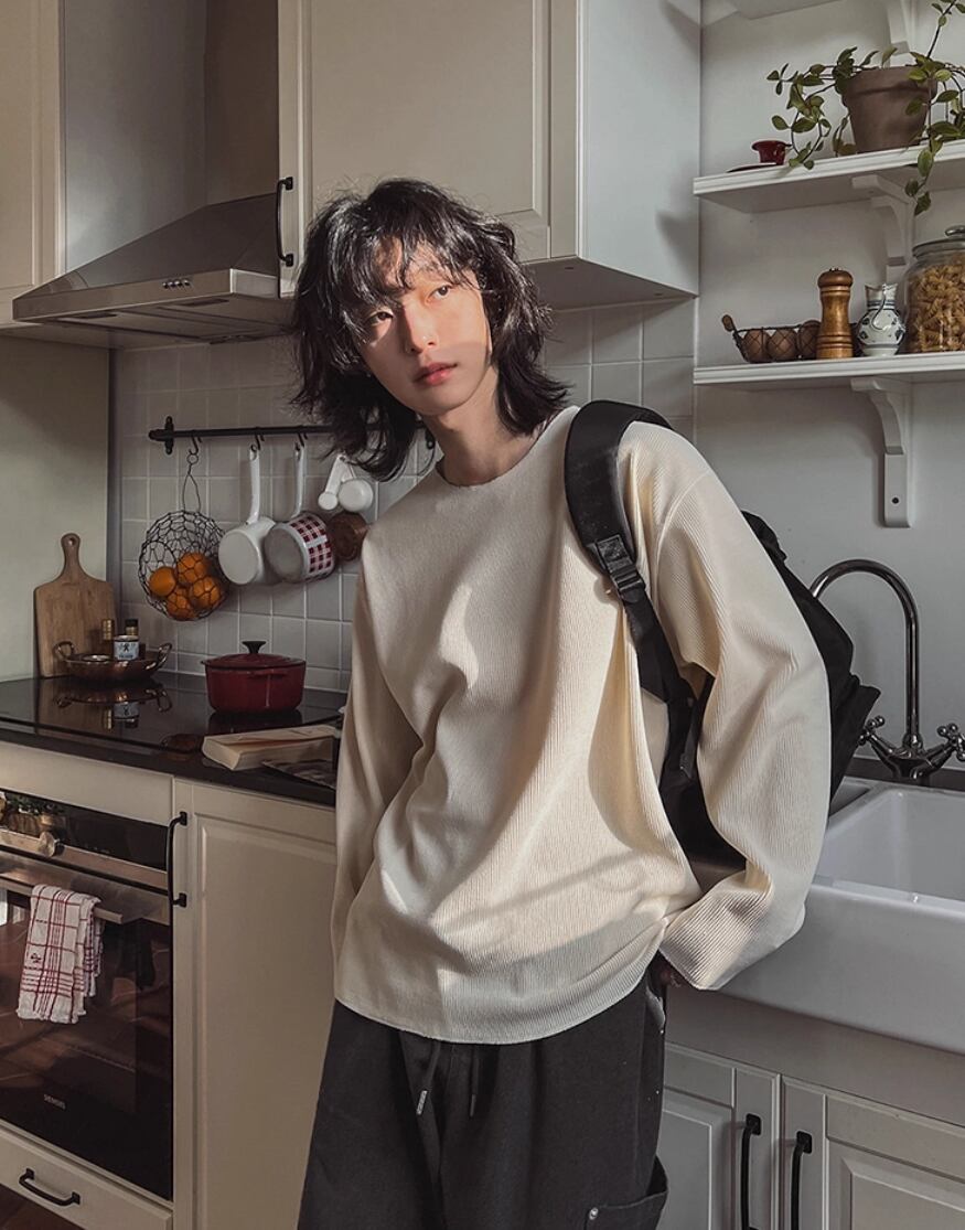 スタイリッシュに決まる韓国スタイルのレイジースタイルワッフル長袖Tシャツ