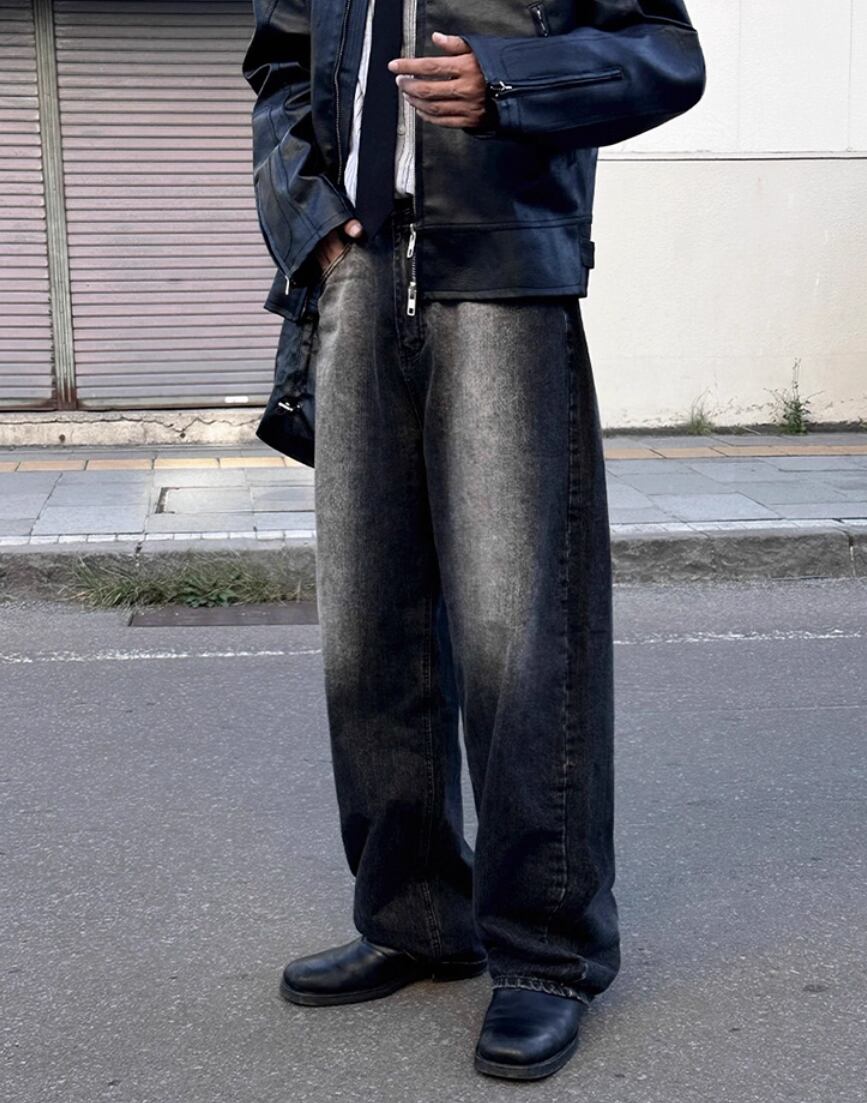 ウォッシュ加工ワイドレッグブラックジーンズ